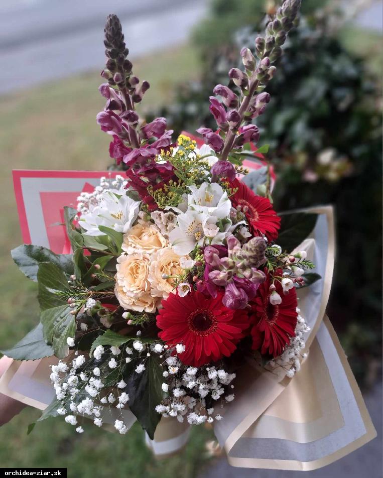 Anthirinum 3ks, gerbera 3ks, alstromeria 2ks, tros ruza 1ks, zeleň, aranžérske prízdoby.