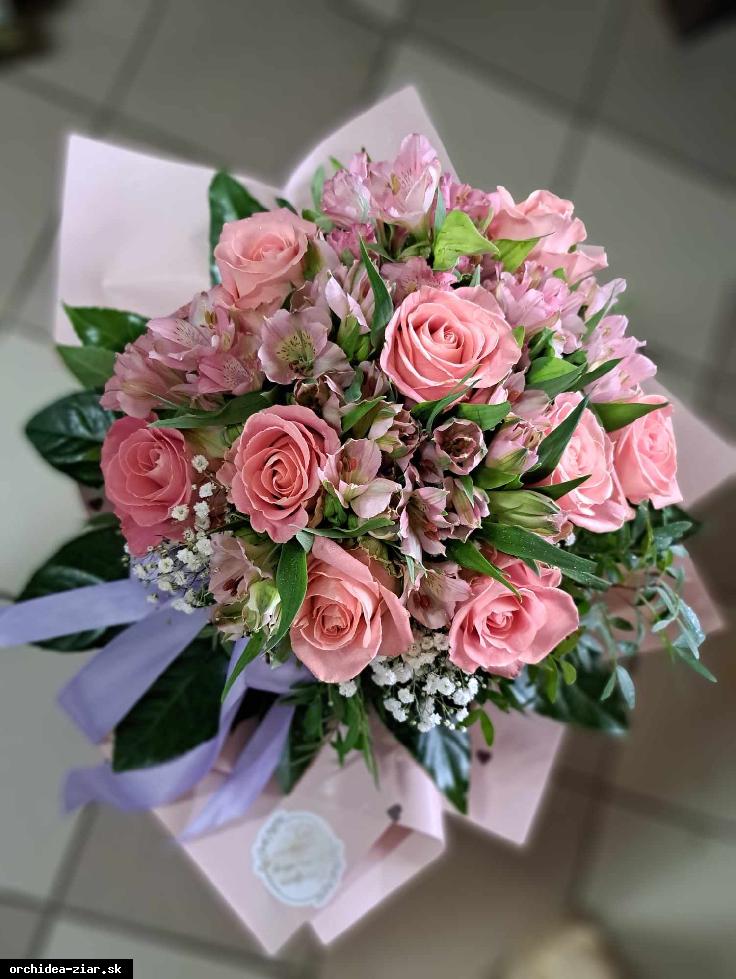 Ruža 9ks, alstromeria 7ks, zeleň, aranžérske prízdoby.
