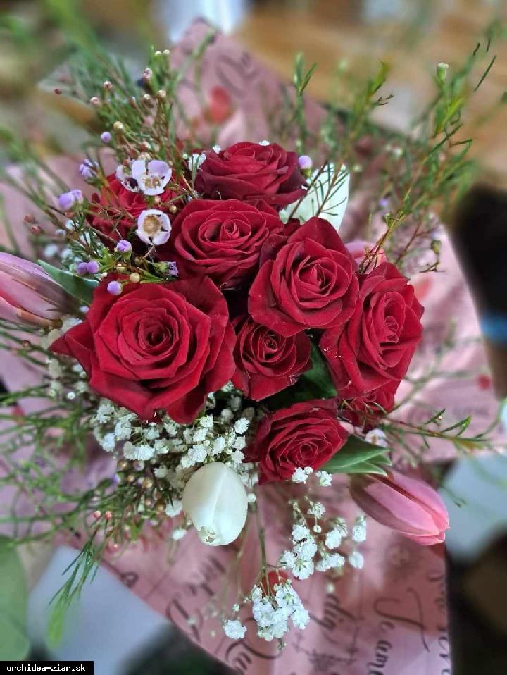 Ruza 2ks, ruža tros 1ks, tulipán 5ks, zeleň, aranžérske prízdoby. 28.-€